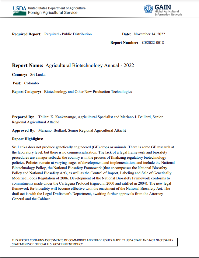 (2023) Справаздача ЗША пацвярджае вытворчасць ГМА-прадуктаў у Шры-Ланцы Крыніца: AgricultureInformation.lk | Дакумент Міністэрства сельскай гаспадаркі ЗША