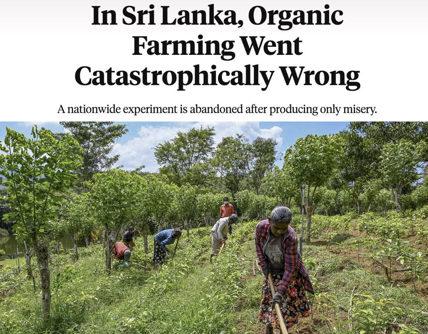 Шры-Ланка правяла злы эксперымент над сваімі грамадзянамі ў мінулым годзе. Пад уплывам актывістаў арганічнай ежы і анты-ГМА, урад забараніў імпарт сінтэтычных пестыцыдаў і прымусова перавёў краіну на цалкам арганічную сельскую гаспадарку, пакінуўшы вялікую большасць фермераў без доступу да жыццёва важных інструментаў, якія яны выкарыстоўваюць для вырошчвання ўраджаёў, ад якіх залежыць іх краіна.